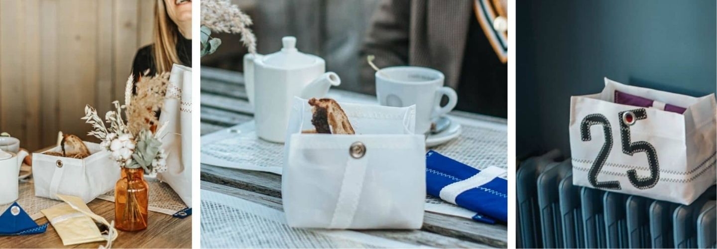 A la maison ou au restaurant, les corbeilles à pain en voile recyclée soufflent un vent marin sur votre table ! Fabriqués à Dinard, ils sont personnalisables. L'art de la table à l'esprit marin se retrouve dans les concept stores Vent de Voyage à Dinard et Saint Malo.