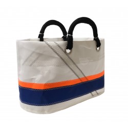 Le petit cabas la Conchée en voile de bateau upcyclée est idéal comme sac de courses pour un tour sur le marché ou une journée à la plage. Résistant, léger et pratique, il a suffisamment d'espace pour y mettre vos légumes du marché ou votre serviette et votre livre pour la plage. Ce sac possède une bande bleu marine et une bande orange rajoutant de jolies couleurs à vos sorties et des poignées tressées bleu foncé qui sont très confortables en porté main.