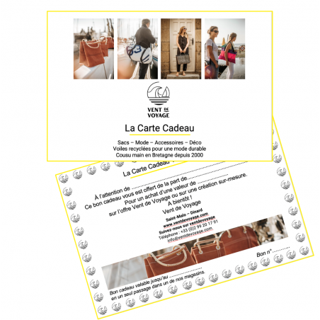 Vous voulez offrir une création Vent de Voyage, mais vous n'osez pas choisir pour son destinataire? Vous préférez offrir la possibilité de réaliser un sac sur-mesure ? La Carte cadeau Vent de Voyage est disponible pour votre hotte de Père Noël !