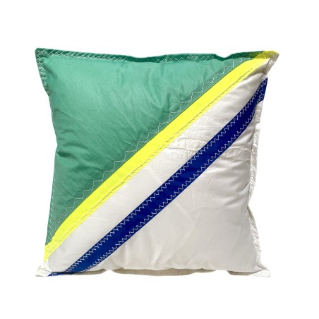 Ce coussin est fabriqué dans notre atelier de Dinard. A partir de voile de bateau recyclée blanche, et personnalisé avec un spi vert et des bandes de couleur.