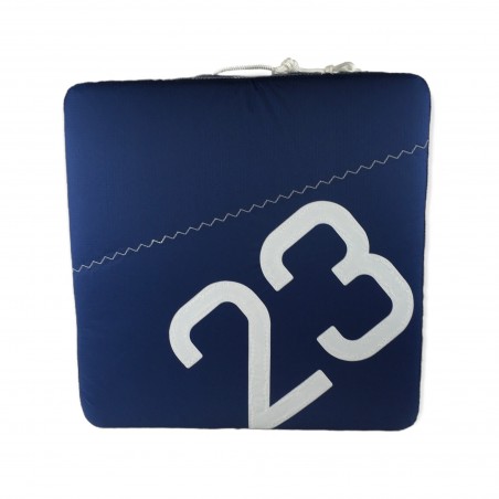 pouf carré plat en voile, bleu marine avec numéro blanc, de face