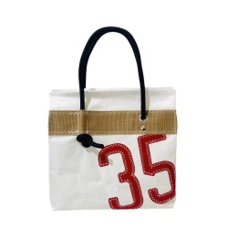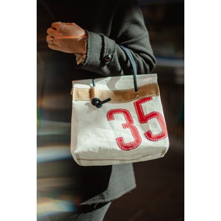 Il est présenté ici avec le numéro 35 rouge cousu avec les fameux point zig zag, classiques de la voile.