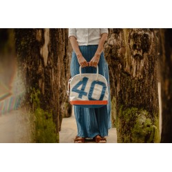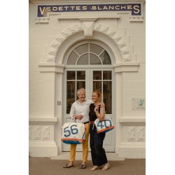 L'incontournable des sacs en voile de bateau recyclée ayant navigué ! Le Jimmy marin avec son numéro en bleu roi sera votre compagnon pour vos activités diverses. Balade, plage, bureau.. C'est un sac à main polyvalent suffisamment spacieux et fermé avec son gros zip blanc. Une poche intérieure vous permettra de rester bien organisé. A la main ou à l'épaule, les anses en bout finition cuir cousu main peuvent se glisser pour un porté plus long à l'épaule.