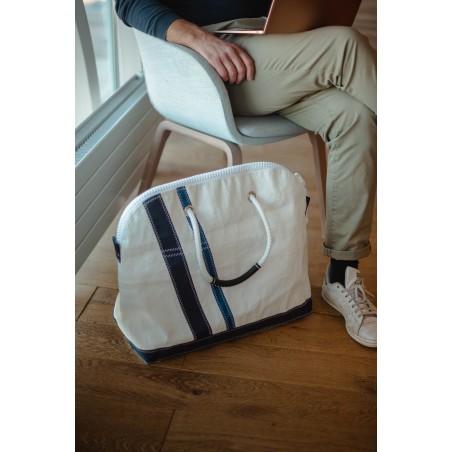 • sac de voyage en voile, blanc avec des bandes bleues, de biais
