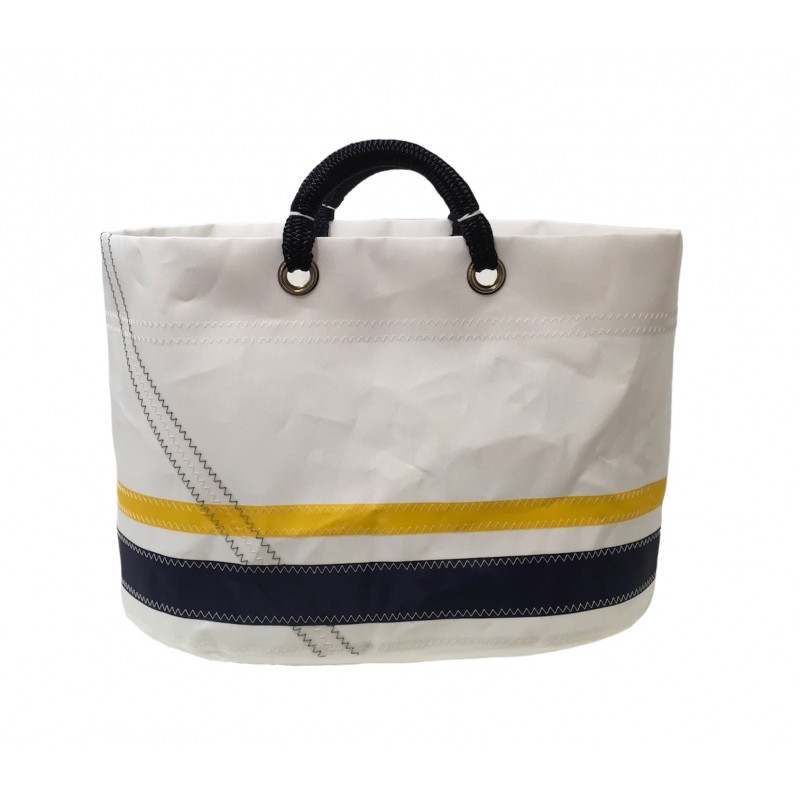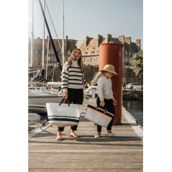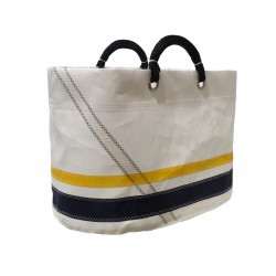 This large declassified boat sail cabas is spacious enough for a day at the sea or in the countryside. You can store the picnic for the whole family, beach toys and several towels. Elegant, its two navy and yellow blue strips add a nice detail to your bag. The dark blue braided handles are very pleasant and will support the weight of your business.