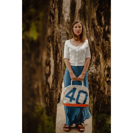 The uncontournable sack of recycled boat having sailed! The marine Jimmy with his blue and orange strips will be your companion for your various activities. Walk, beach, office.. It is a versatile handbag sufficiently spacious and closed with its large black zip. An inner pocket will allow you to stay well organized. At the hand or shoulder, the handles in the finish hand stitched leather can slip for a longer wear on the shoulder.