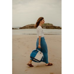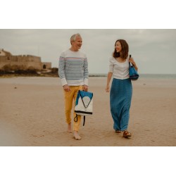 The uncontournable sack of recycled boat having sailed! The marine Jimmy with his blue and orange strips will be your companion for your various activities. Walk, beach, office.. It is a versatile handbag sufficiently spacious and closed with its large black zip. An inner pocket will allow you to stay well organized. At the hand or shoulder, the handles in the finish hand stitched leather can slip for a longer wear on the shoulder.