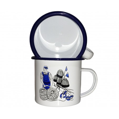 Light and unbreakable, this mug passes to the dishwasher. White enamelled mass and blue edge.