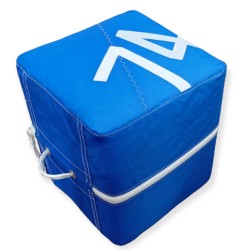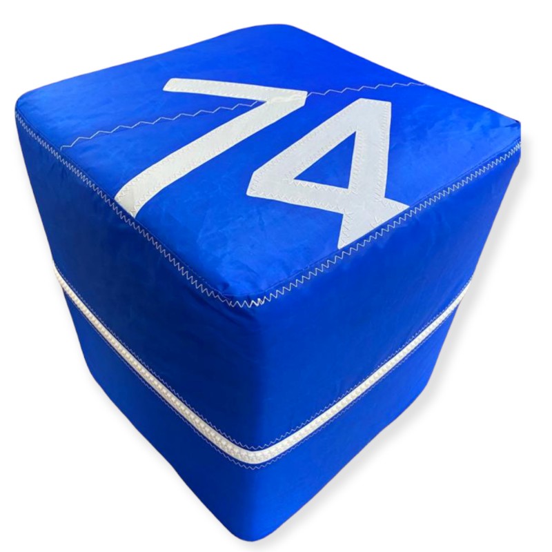 A masterpiece from home Vent de Voyage to decorate your interior or your exterior! The square pouf exists in blue or red with two different sizes and a white number.