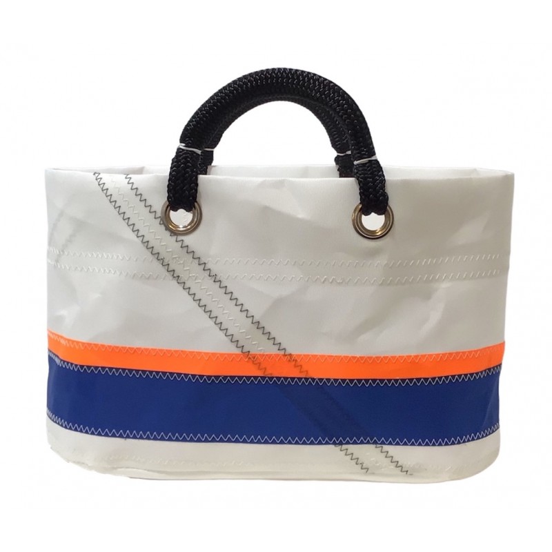 The small cabas la Conchée en sail de boat upcyclée is ideal for a tour on the market or a day at the beach. Resistant, light and convenient, it has enough space to put your vegetables from the market or towel and your book for the beach. This bag has a navy blue strip and an orange strip that adds nice colors to your outputs and dark blue braided handles that are very comfortable hand-held.