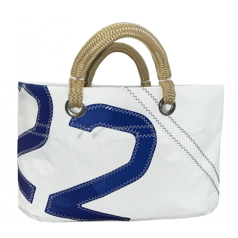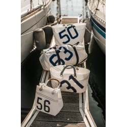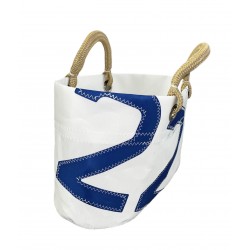 The small cabas la Conchée en sail de boat upcyclée is ideal for a tour on the market or a day at the beach. Resistant, light and convenient, it has enough space to put your vegetables on the market or towel and book for the beach. This bag carries number 22, it reminds you can be a date, a lucky number, the department of the Côte d'Armor... and dark blue braided handles that are very comfortable to carry by hand.