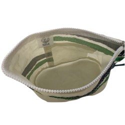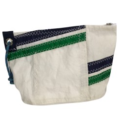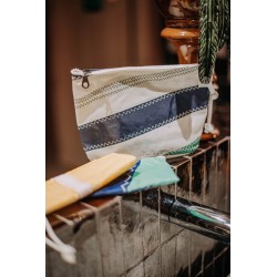 Made of sail having sailed, authentic black and white zigzag seam, you can use it to store several things. An internal pocket will allow you to store your most valuable business like keys or papers. Closed by a zipper, contains a small tip to hold it somewhere or hold it, small inner pocket.