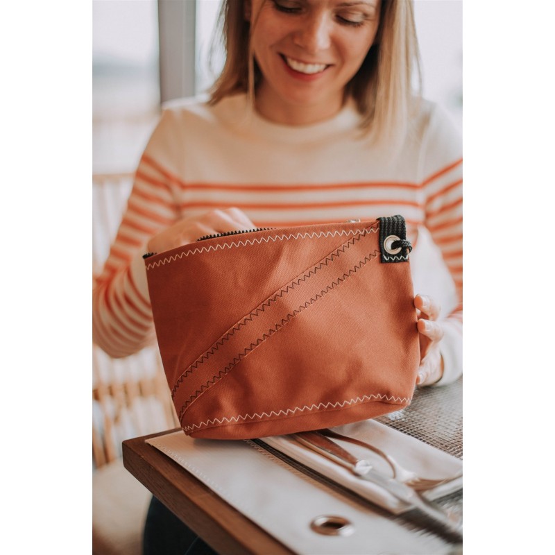 Made in sail of old riggings, authentic black and white zigzag seam, you can use it to store several things. An internal pocket will allow you to store your most valuable business like keys or papers. Closed by a zipper, contains a small tip to hold it somewhere or hold it, small inner pocket.